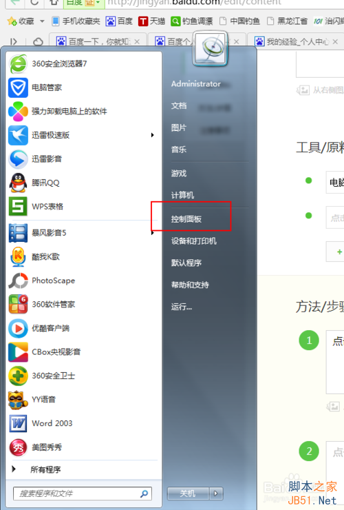 点击‘开始’选择控制面板