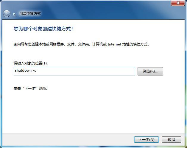 2、在弹出的对话框,请键入对象的位置输入“shutdown -s”,点击“下一步”。