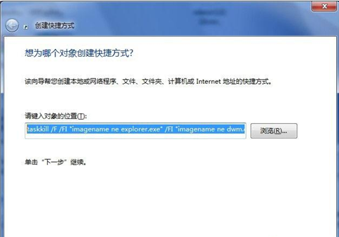 2、请键入对象的位置处输入: Taskkill /F /FI "imagename ne explorer.exe" /FI "imagename ne dwm.exe",按“下一步”。