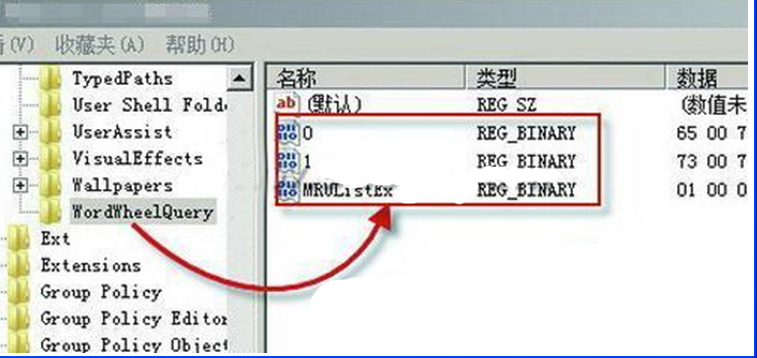 2、在注册表编辑器中依次找到定位到:HKEY_CURRENT_USERSoftwareMicrosoftWindowsCurrentVersionExplorerWordWheelQuery。