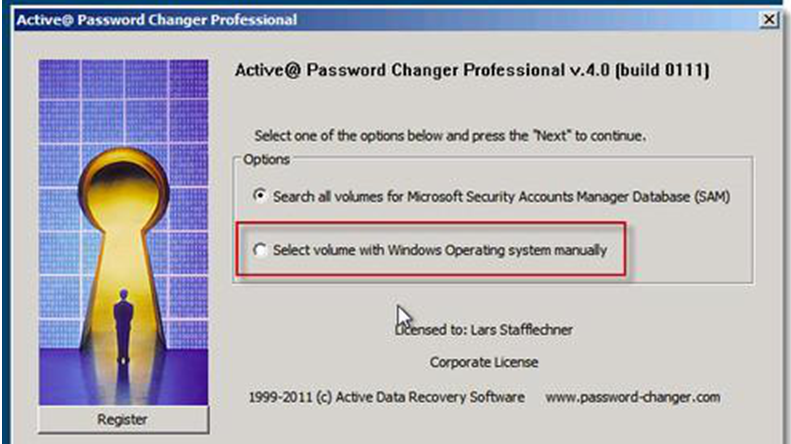 2、运行“Active Password Changer”软件,由于通常系统安装在C盘上,所以软件只需要扫描系统盘即可,故在打开的软件界面中选择:“Select volume with Windows Operating system Manually”。