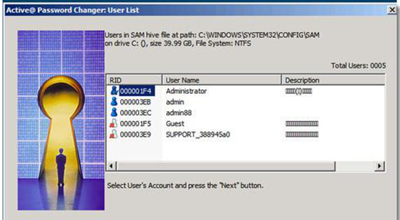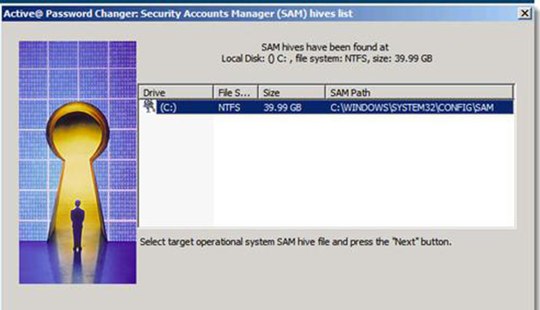3、选择C盘后点击“NEXT(下一步)”,就会扫描存储用户密码的数据库SAM文件,再次点击“NEXT(下一步)”就会扫描到用户。
