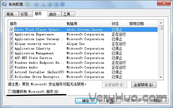 3、单击“服务”选项卡,单击以选择“隐藏所有 Microsoft服务”复选框,然后单击“全部禁用”。