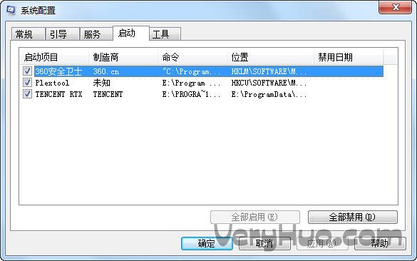 4、单击“启用”标签卡,然后点击“全部禁用”并确定。