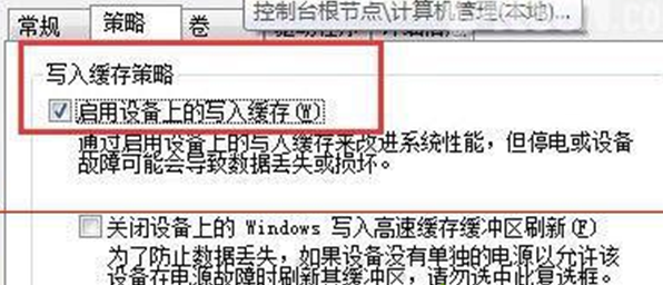 4、在“属性”窗口中切换到“策略”标签页,勾选“启用设备上的写入缓存”,点击确定保存。