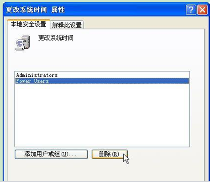 4、在打开的属性窗口中将所有用户删除掉,这样就没有用户可修改系统时间了。