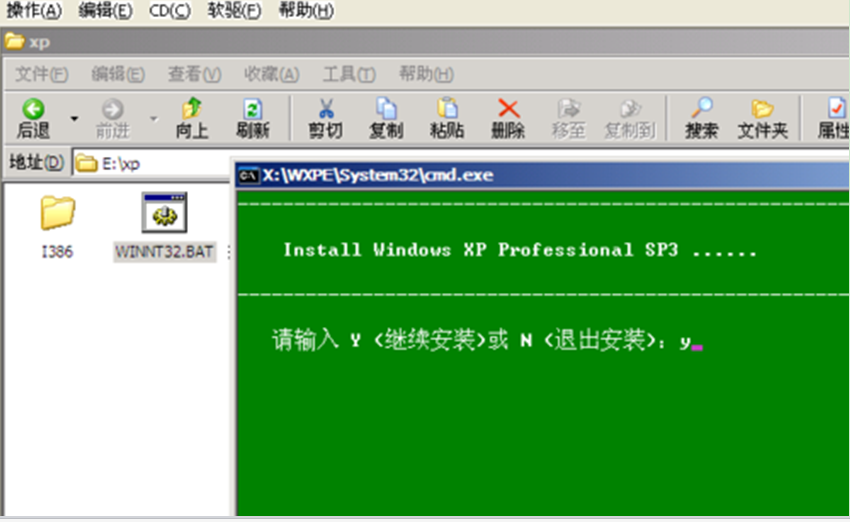 3、进入光驱中,运行WINNT32.BAT,开始安装XP,在下面窗口中选择输入“y”,按回车键继续。分区的窗口中输入“c”,按回车键开始安装。