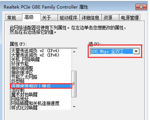 4、在“属性”列表中选项“连接速度和双工模式”,然后在值处选择“10Mbps全双工”,点击“确定”保存,这样网卡就限制在最大10M的带宽下,即最大下载速度“1MB/秒”。