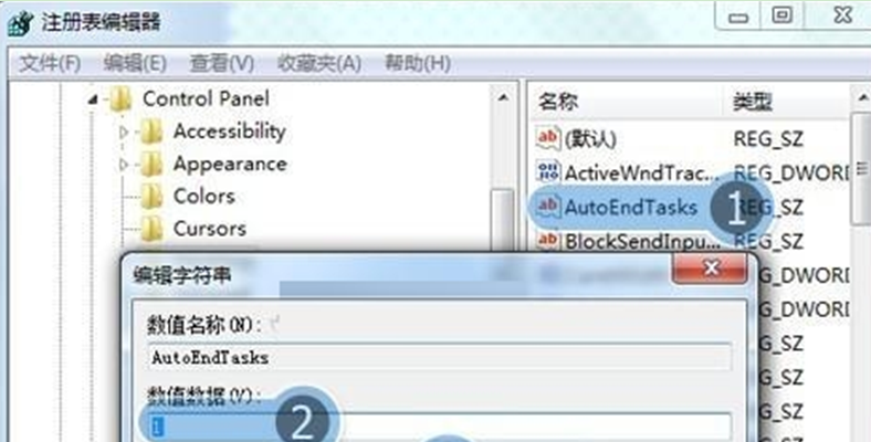 3、在右侧窗口中找到并双击“AutoEndTasks”,将数值修改为“1”,点击“确定”按钮保存;
