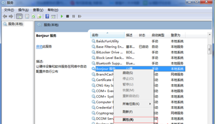 3、进入系统服务,找到并右键“bonjour服务”选择“属性”。