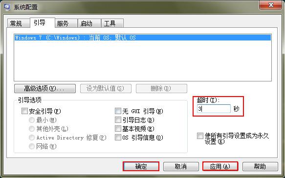 2、在打开的系统设置,切换到“引导”标签页,然后在超时中输入一个自己觉得合适的数字,然后点击“应用—确定”按钮。
