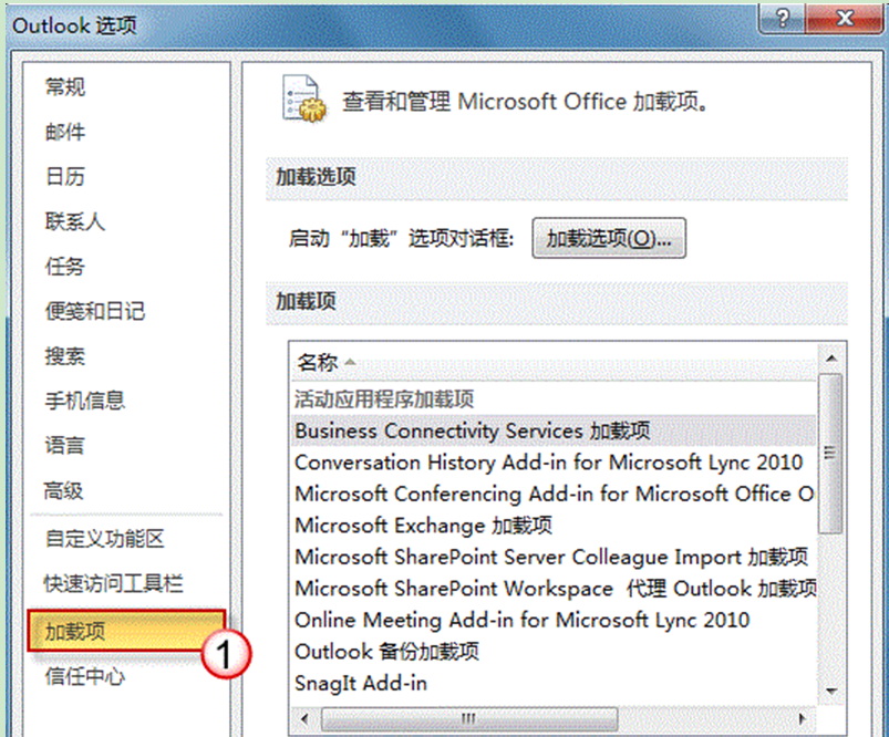 2、在“outlook选项”界面左侧点击“加载项”。