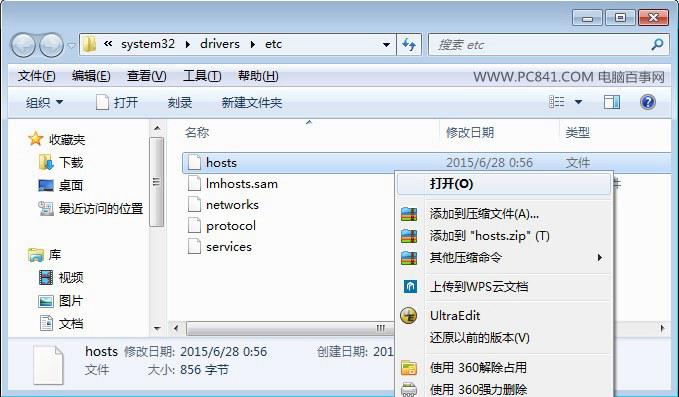 2、在hosts文件上右击,选择“打开”就可实现修改。