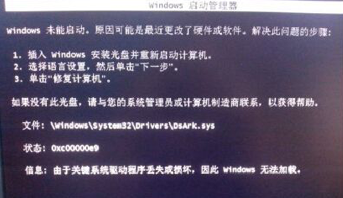 很多用户使用电脑时,会遇到开机故障,无法进入系统的问题,比如最近有用户开机无法进入系统,提示\Windows\system32\drivers\DsArk.sys的问题,其实这是系统关键驱动程序丢失或损坏,导致windows无法加载的原因,下面小编给大家分享开启电脑公司Windows7旗舰版提示DSARK.sys损坏的解决措施。