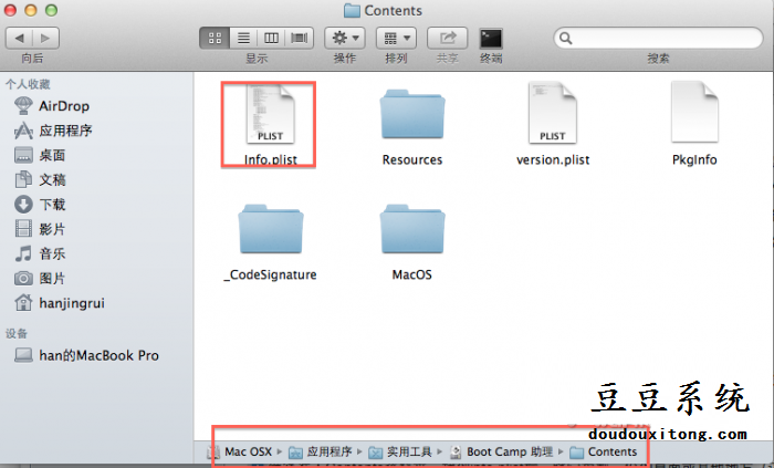 2、打开“Finder——实用工具——boot Camp助理——Contents中找到Info.plist”的这个文件,把Info.plist复制到桌面或其它地方进行修改。