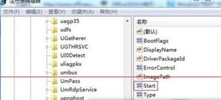 3、在右侧窗口中找到并双击“Start”,将数值修改为“4”,点击“确定”保存后退出注册表。