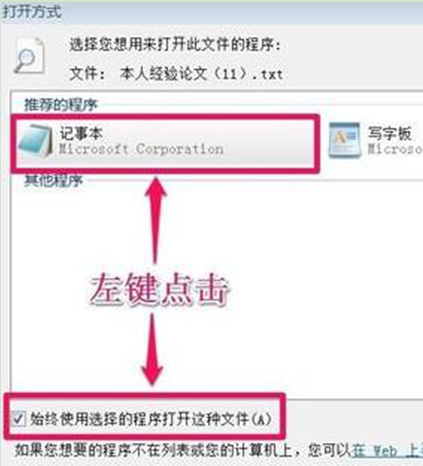 3、弹出打开方式窗口中,点击记事本,然后勾选下方的“始终使用选择的程序打开这种文件”,再点击“确定”按钮。