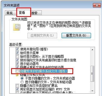 2、切换到“查看”标签页,去掉“隐藏受保护的操作系统文件”前面的勾,并选择“显示所有文件和文件夹”,设置完成后点击确定按钮。