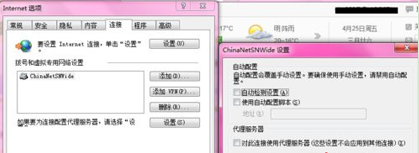 办法三、设置网络代理来解决:打开浏览器,点击“设置——Internet选项——连接”,取消网络连接代理的勾选。