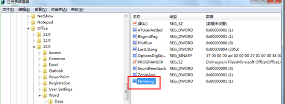 2、在打开的注册表中,展开以下注册项HKEY_CURRENT_USER\Software\Microsoft\Office\14.0\Word\Options。