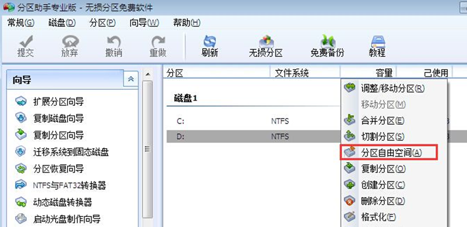 2、选择将哪个盘的空间腾出一些来,扩展给C盘,这里以将D盘的空间扩展给C盘一些为例。那么右键D盘,选择“分区自由空间”。