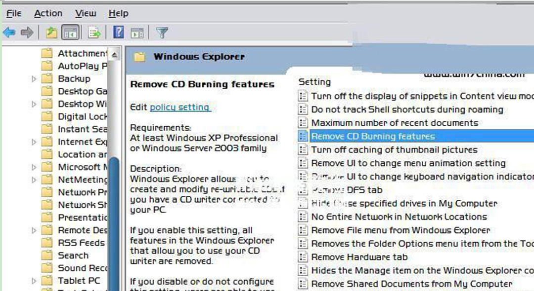 3、选中Windows Explorer,然后在右侧窗口中找到Remove CD Burning features(移除CD刻录功能)并双击,选中Enable(开启),重启生效。