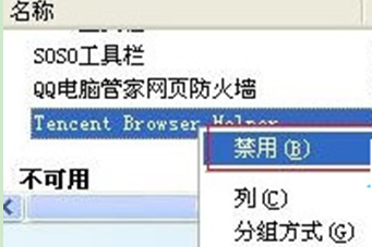2、然后在打开的“管理加载项”窗口中,点击“工具栏和扩展”,在右侧的选项框内找到tencent browser helper,然后选择“禁用”。