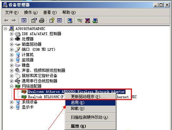 2、如果是有红色的叉叉,在网卡上右键选择启用即可。