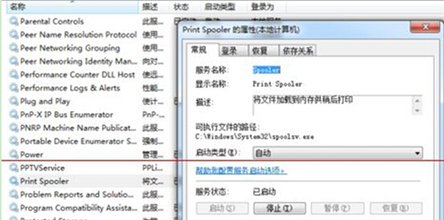 3、如果print spooler未启动,可将选项开启,在print spooler选项上右键,选择属性