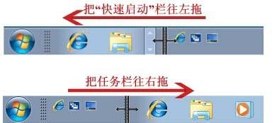5、这样基本上就只显示图标了,我们还可对工具栏进行拖动,拖动到什么位置就由你定了,XP是在开始菜单附近,移动好了以后把任务栏再锁定一下,接着你可以把你想放的图标放到快速启动栏里了。
