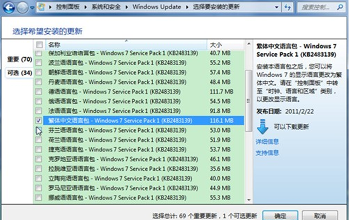 2、在弹出的窗口左下方有Windows Update选项,运行Windows Update功能,待Win7系统自动检测来自微软的所有更新补丁,点击“可选更新”,在windows7 language packs中选择自己需要的语言包,比如繁体中文或英文,然后进行下载补丁,并按提示安装补丁。在这里注意无需全部下载,根据自己需求下载,否则浪费磁盘空间,另外其它系统提示的补丁,也需要根据你自己的需要和实际情况来选择。