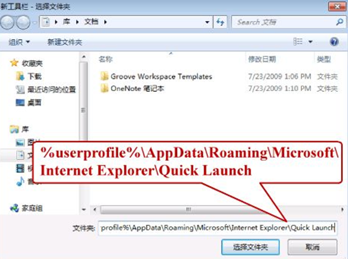 1、右击“任务栏”——选择“工具栏 ”——新建工具栏。在文件夹位置输入:%UserProfile%\AppData\Roaming\Microsoft\Internet Explorer\Quick Launch,然后按回车。