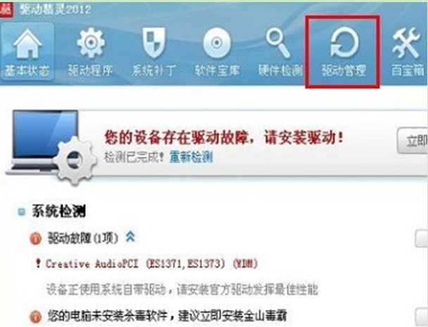 下载最新版本的驱动精灵,进入界面后,选择驱动管理,卸载原有的声卡驱动,在重新进行检测安装即可。