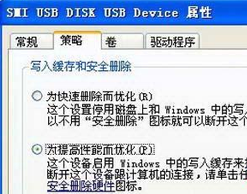 4、在弹出的属性面板中切换到“策略”选项卡,便可看到系统默认的“为快速删除而优化”项,更改为“为提高性能而优化”即可。