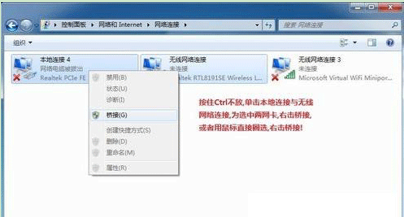 2右键“本地连接与无线网络连接”选择“桥接”。