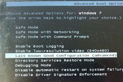 2、键入F8后,系统会出现树形菜单可选择,选择last known configuration,表示上一次可正常启动配置。