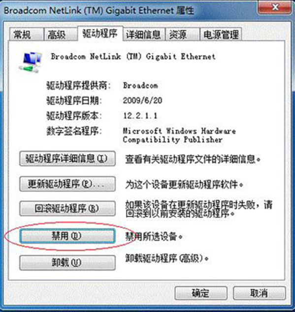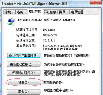 3、在弹出的网卡属性窗口中,切换到“驱动程序”标签,点击“禁用”,如下图: