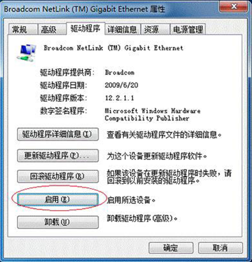 5、此时在网卡属性中,原来的“禁用”按钮变成了“启用”,而且“网络”图标也出现了一个红叉,点击“启用”,继续下一步。