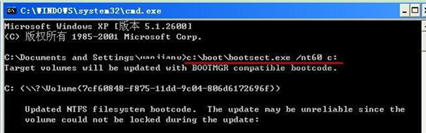 1、在XP系统中点击“开始——运行”,填入“CMD”命令后按回车,在命令行窗口键入,c:\boot\bootsect.exe /nt60 c: 命令后按回车。