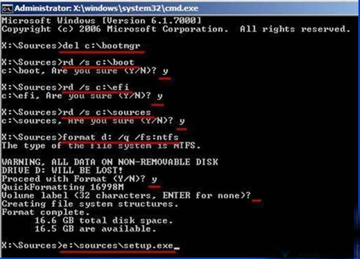 3、为避免装Win7 系统时启动文件混乱导致失败,请清理启动文件(即原来拷贝到C盘的bootmgr文件和boot、efi、sources文件夹)。分别在命令行窗口输入以下命令并按回车: