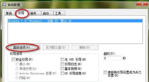 2、在“系统配置”对话框中切换到“引导”选项卡界面,点击“高级选项”按钮进行对引导所使用的CPU核心数和最大内存进行设置。建议使用双核CPU的读者将CPU核心数设为2,最大内存容量设为自己电脑里的内存大小。