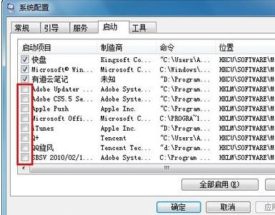 在这里列出的就是Win7所有开机启动项了,如果不想让某个项目开机启动,点一下该项目前面的对勾,将其取消勾选,然后点击“确定”按钮保存设置就可以了。
