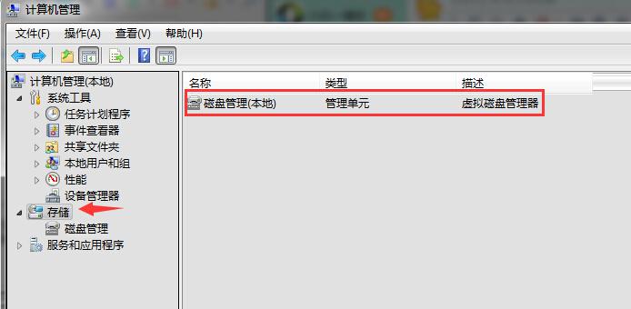 2、在出现的“计算机管理”菜单中,选择“存储”下面的“磁盘管理”键值。
