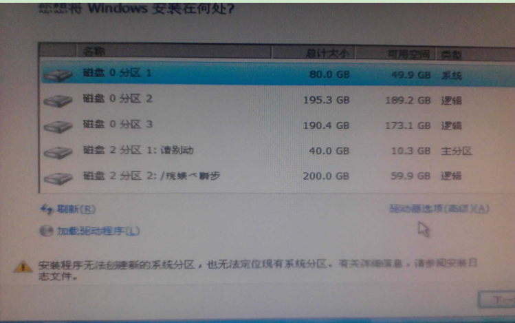 再点击“您想将Windows安装在何处?”窗口中的 “刷新”选项后就会出现我们希望的分区结果,到此分区操作结束,怎么样?用此方法分区是不是既简单又方便呀?
