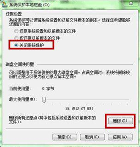 3、在弹出的“系统保护本地磁盘”窗口中,把“还原设置”改为“关闭系统保护”,再单击“删除”;