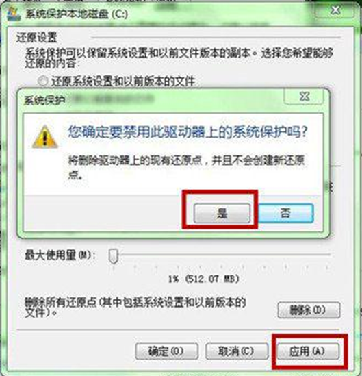 6、在系统保护本地磁盘窗口中点击最下方的“应用”,弹出一个对话框选择“是”,最后点击“确定”即可。