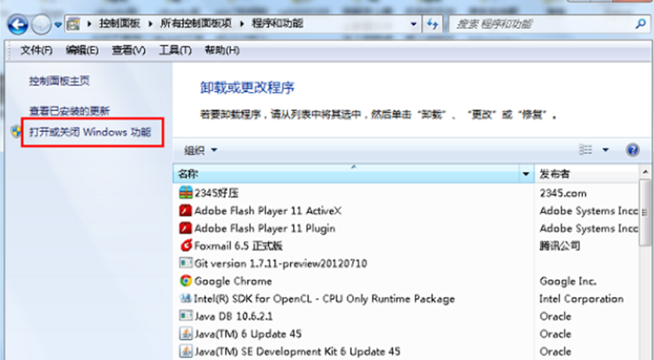 1、依次点击“开始——控制面板——程序和功能——打开或关闭windows功能”;