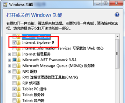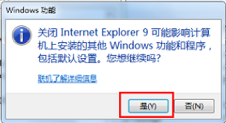 2、弹出windows功能对话框,找到“Internet Explorer 9”,将前面的勾去掉
