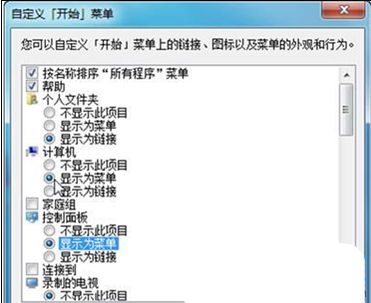 3、在打开的“自定义‘开始'菜单”窗口中,选中“计算机”以及“控制面板”下的“显示为菜单”单选按钮。