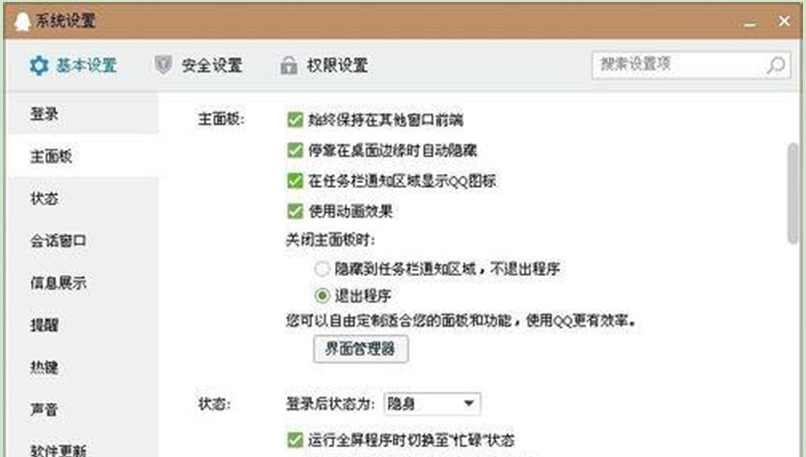 3、在打开的“系统设置”窗口中,切换到“主面板”标签页中,在“在任务栏通知区域显示QQ图标”选项前面打勾。
